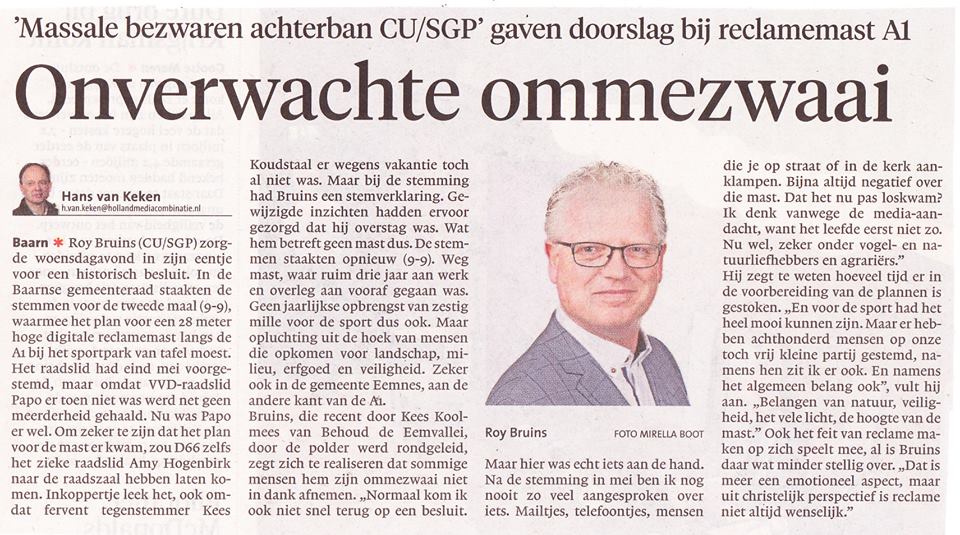En daarom stemden wij op 30 juni jl. in de gemeenteraad voor de komst van de reclamemast mede omdat we eerder al hier ook voor zijn geweest. Inspraakreacties die er eerder die maand in aanloop naar het besluit te horen waren wierpen voor ons niet direct een ander licht op de zaak.
